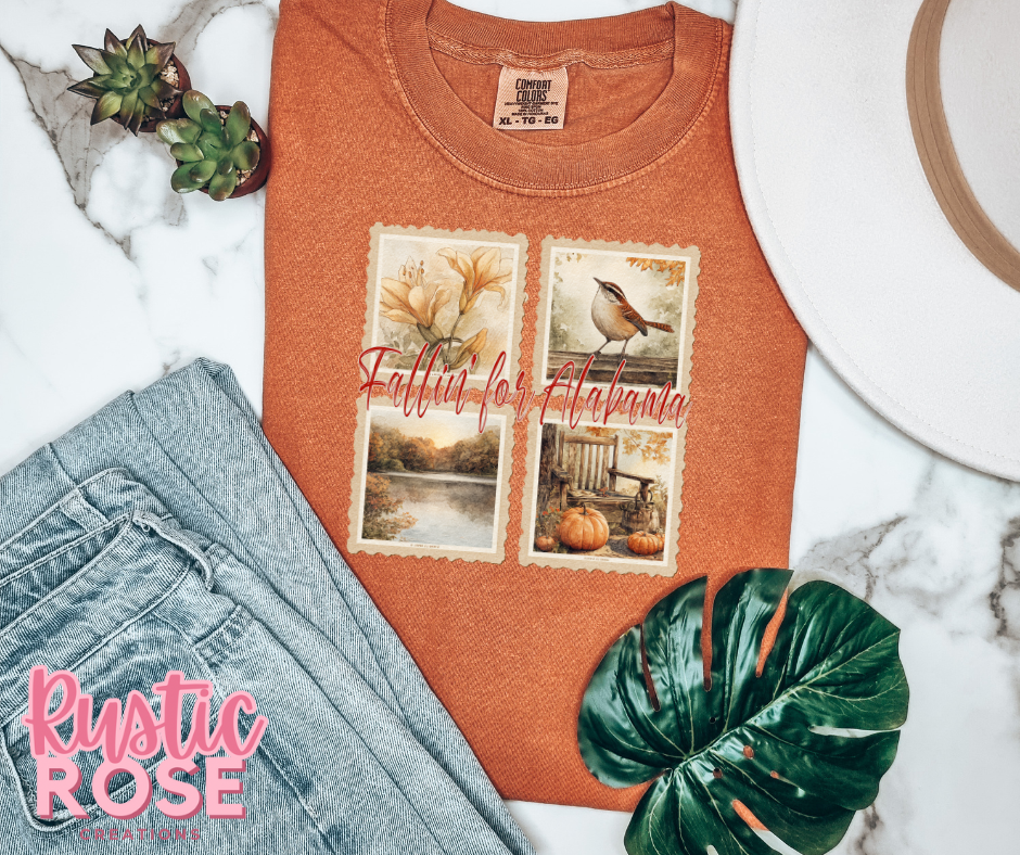 Stay cozy and stylish with the Fallin' For Alabama high-quality Comfort Colors T-shirt. Perfect for cooler weather or layering under a cardigan, this playful tee adds warmth and charm to your autumn wardrobe.