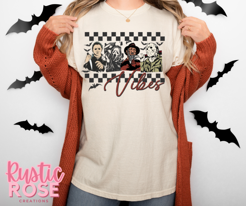 Get into the spooky spirit with Horror Vibes, featuring some of the most popular and original horror characters. This playful design brings a fun twist to your Halloween wardrobe, perfect for celebrating the season with a dash of fright and delight.