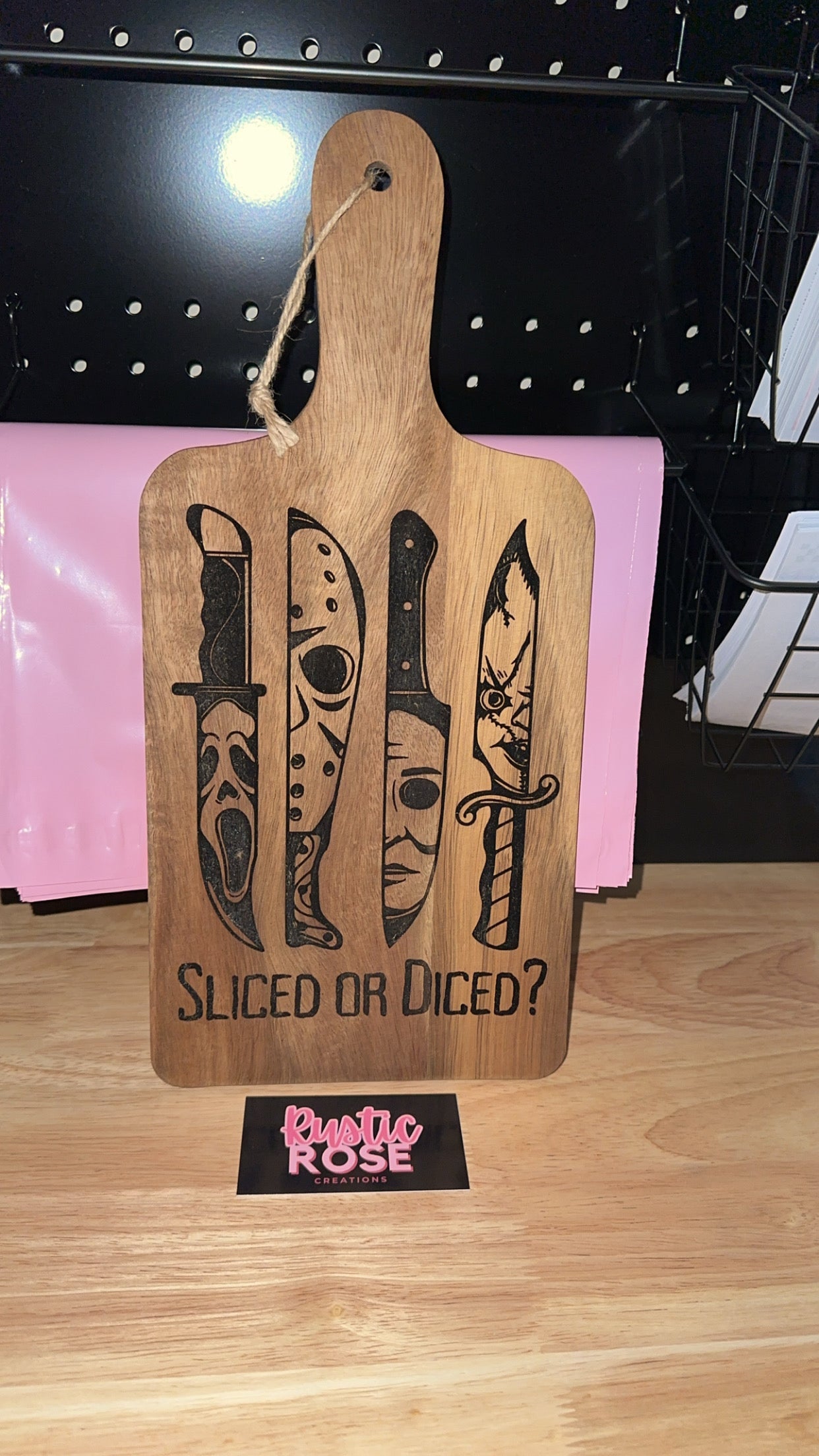 Indulge in a touch of terror with our Sliced or Diced Cutting Board. Perfect for Halloween enthusiasts and horror movie lovers, this board adds a spooky touch to your kitchen. Opt for the sliced or diced design and get ready to elevate your cooking experience. Board colors and style may vary as each are unique but they are all 15x7. Please allow 2-3 weeks to prepare and ship or be ready for local pickup.
