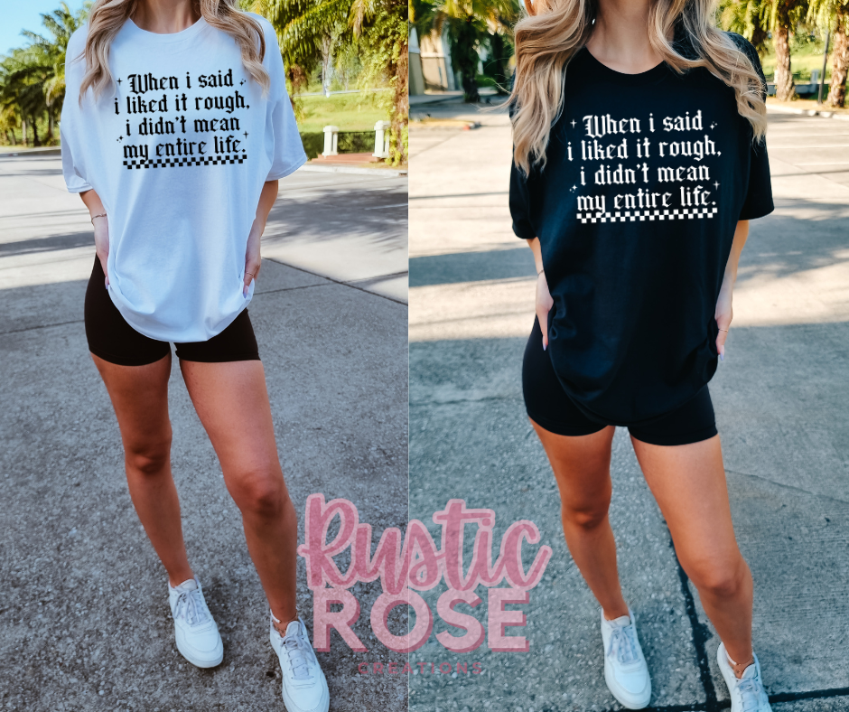 Get ready to add some humor to your style with our "When I Said I Like It Rough..." shirt. Because let's be honest, when I said I like it rough, I didn't mean my entire life. So why not have some fun with it? Show off your playful side with this quirky shirt.